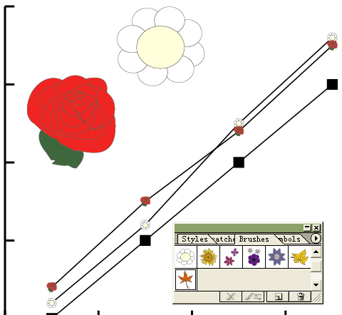 選object->graph->marker,單擊ok,就會將數(shù)據(jù)點(diǎn)用筆刷圖案代替了。如圖15。當(dāng)然此例中完全可以自己繪制圖案,但用現(xiàn)成的筆刷要快捷一些。