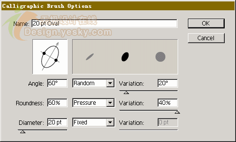 筆刷的傾角、圓度和直徑都是可以動態變化的。你可以在右邊的下拉框里面選定它的變化方式:random(隨機)、pressure(壓力)和fixed(固定),還可以拖動滑塊限定這個變動的范圍。