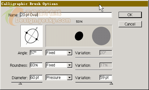 設定好了畫筆,還不能直接書寫。我們還需要選定一個書法筆刷進行修改。首先打開brush面板(f5),看到那個橢圓形的筆刷了嗎?雙擊它打開如圖的書法筆選項對話框: