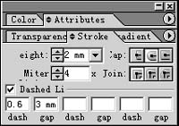 6. 在圖層“走向”之下建立一個新圖層,命名為“圖案”。使用“pen”(鋼筆)工具,先繪畫出一片完整的大葉子正視圖,打開“stroke”(勾邊)面板,設置線粗為2,端點為圓形,勾選“dashed li”(虛線),設置虛線長度為0.6,間距為3,如圖2所示。全選這片葉子,按下“ctrl+g”組合鍵將其組合。