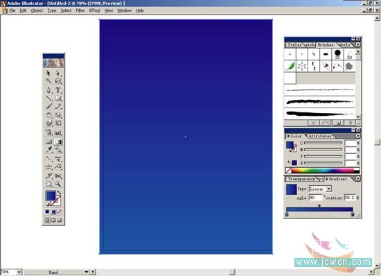 3.將畫布上的五角星刪除了,然后用rectangle tool工具畫一個和畫布一樣大小的矩形。選擇gradient tool工具,接著再打開window>gradient或按f9,打開gradient面板。type選擇為linear,一邊顏色為:c= 92,m=50,另一邊為:c=95,m=95,按住shift鍵,從上到下拉一個漸變。這樣一個藍色的天空就完成了。