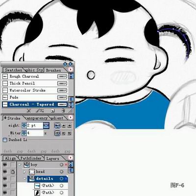 5.選中head路徑,選擇window/brush libraries/artistic_chalk charcoal pencil(窗口/筆刷庫/藝術家—粉筆炭筆鉛筆),選擇charcoal-tapered筆刷,給路徑運用筆刷效果。(圖f-5所示)