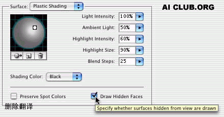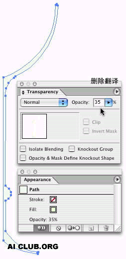 3.打開transparency面板,將輪廓的透明度設置為35%到50%之間。在打開appearance面板,確定輪廓的邊框stroke為關閉。