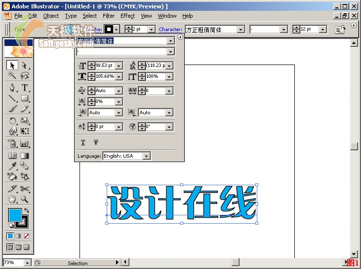 2、選中輸入的文本,單擊工作區(qū)上方(默認(rèn)位置在上方,也可以將其拖放到其它自己喜歡的位置)控制面板中的fill右側(cè)顏色選取框,選擇顏色為青色,然后在stroke右側(cè)選擇一種描邊類型,再單擊character右側(cè)字體下拉列表,選擇字體“方正粗倩簡體”。在最右側(cè)可以設(shè)置字體大小。