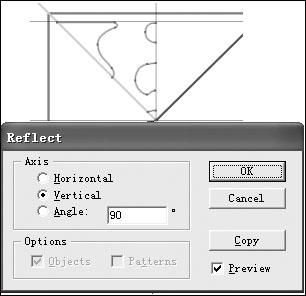 6. 將圖形全選,選擇“reflect(鏡像)”工具,在十字中心點(diǎn)上單擊并同時(shí)按下“alt”鍵,彈出對(duì)話框,勾選“vertical(垂直)”,單擊“copy(復(fù)制)”按鈕,如圖3所示。