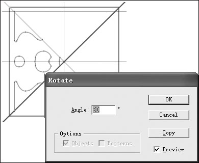 7. 接下來,依次選中中間圖形的兩個(gè)端點(diǎn),選擇菜單“object→path→join(連接)”命令,彈出對(duì)話框,勾選“smooth(圓滑)”。目前,我們獲得了一個(gè)四分之一的圖案,全部選中圖像,選擇“rotate(旋轉(zhuǎn))”工具,同樣,在十字中心點(diǎn)上單擊并同時(shí)按下“alt”鍵,彈出旋轉(zhuǎn)對(duì)話框,在“angle(角度)”欄內(nèi)輸入“90”,單擊“copy(復(fù)制)”,如圖4所示。按下“ctrl+d”兩次,再復(fù)制出兩組圖形。