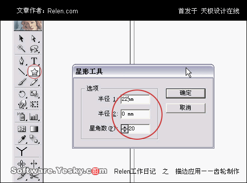 打開illustrator10,選擇工具欄中的星形工具,并在頁面上單擊。單擊后出現了星形工具的選擇面板。在面板中輸入:半徑1:22mm(這個數值可以自己調換);半徑2:0mm(這個數值不變);星角數:20(這個數值也可以自己調換)。