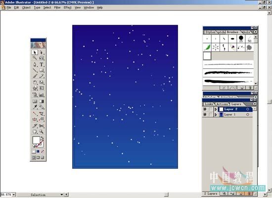 4.現在開始繪制滿天的星星。先打開window>layer或按f7打開layer面板,按面板上的新建按鈕,建立一個新層。選擇pencil tool工具,將前景色關閉,在畫面上隨意的畫圈。