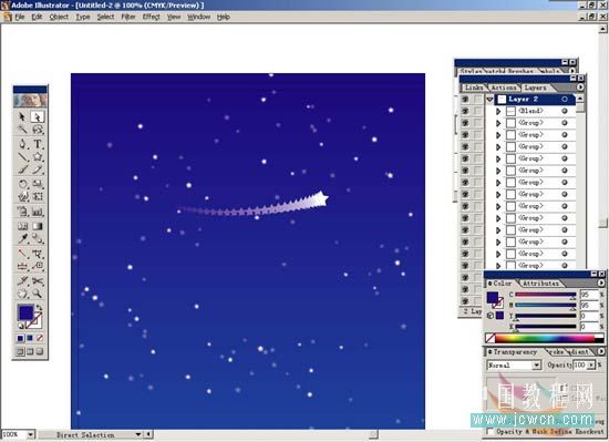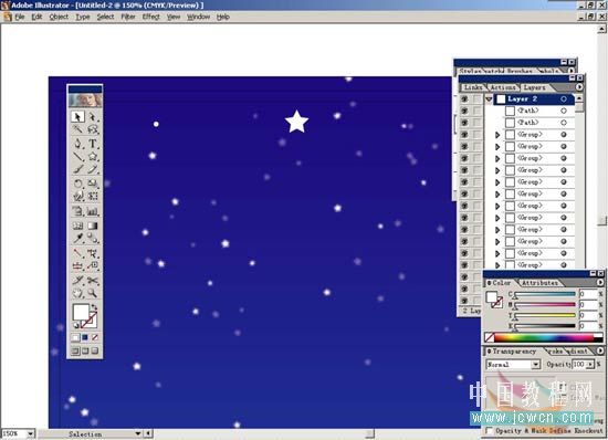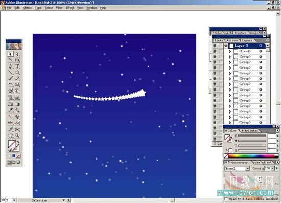 9.打開layer2的小三角會顯示出所有星星的單獨路徑,按住alt+shfit鍵,在layer2中有間隔的任意點擊選出一部分星星,再打開transparency面版,將opacity設定為100%。