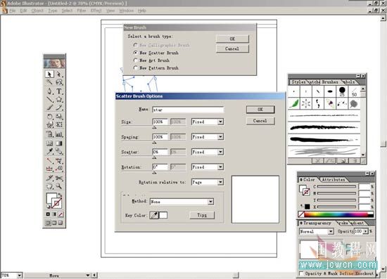 2.打開window>brushes或按f5打開brushes面板。用selection tool工具選中五角星并將其拖到brushes面板上,跳出定義筆刷的對話框,按ok按鈕會再跳出一個筆刷設置的對話框,在name里面輸入star,按ok按鈕確定。
