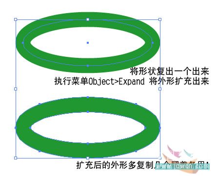 將形狀復制一個,執行菜單object(對象菜單)——expand(擴展工具)將外形擴充出來,擴充后的外形多復制幾個留著備用(擴充后的形狀主要用來做陰影等,原來沒擴充的依然要留著)
