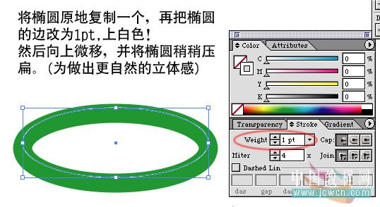 將橢圓原地復制一個,再把橢圓的邊改為1pt,上白色,然后向上微移,并將橢圓稍稍壓扁,橢圓為未擴充為形狀的橢圓(為做更自然的立體感)