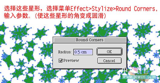 選擇這些星形,選擇菜單effect(濾鏡)——stylize(風格化)——round corners(圓角),輸入參數(使這些星形的角變成圓滑)
