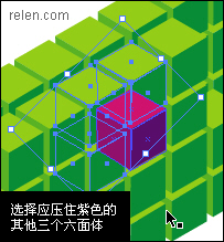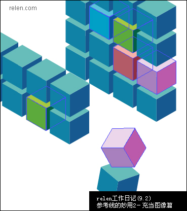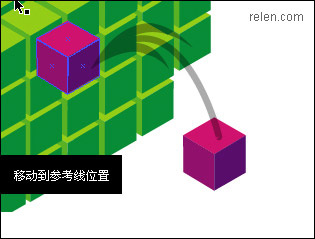 3, 現在要做的是把新的六面體挪回到六面體陣列里。想要依舊對齊物體,看起來就沒那么容易了。怎么辦呢?其實很簡單,如果你還記得參考線的制作。那么跟著relen,只需要2個步驟。