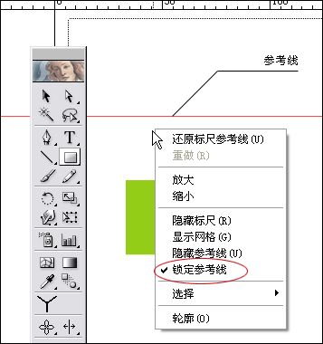 【ctrl +r】打開標尺,從水平標尺區(qū)拖拽出一條參考線。在畫板上點擊右鍵,如果看到鎖定參考線選項被選中,把它關閉。我們就激活了參考線。