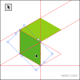 最后挪動第三個菱形的上、左兩點,利用參考線挪動到指等定位置。更改第三個菱形的顏色。六面體就制作完成了。我們可以轉換到輪廓模式上觀察這些點是否交叉密合,更進一步做到精確圖形。