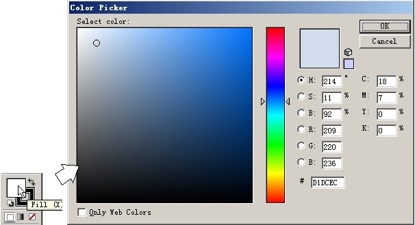 可以用鼠標在對話框的顏色選擇區中選取顏色,也可以直接輸入各種顏色成分的數值。如輸入c=18、m=7、y=o、k=0,單擊ok按鈕即可填充顏色。