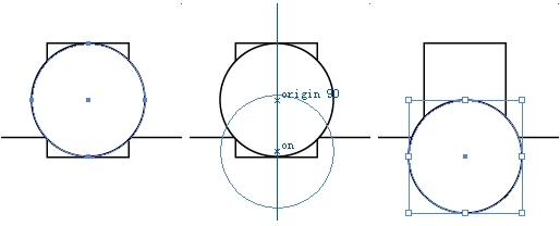 selection tool(選擇工具),選擇并拖動正圓的中心點,沿自動生成的垂直參考線向下移動到矩形底邊線與參考線交點時釋放鼠標,智能參考線會自動將正圓圓心與交點對齊,如(圖8)所示。