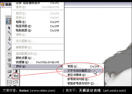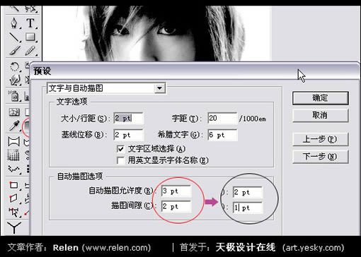 既然知道是以色彩差值的位置來自動描圖,很多朋友一定會立刻想到。色彩差值多少一定是可以選擇的。沒錯。更改取值的位置是在“菜單>預設>文字與自動描圖”的選項里。認為使用菜單步驟麻煩的朋友可以鍵入快捷健[ctrl + k]。