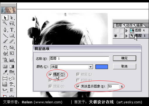 彈出圖層選項面板。注意點選模板選項,把黑白圖像所在圖層設置為模板。點選后,圖層選項就被鎖定,唯一可調節的是變淡顯示圖像數值:50%即可。