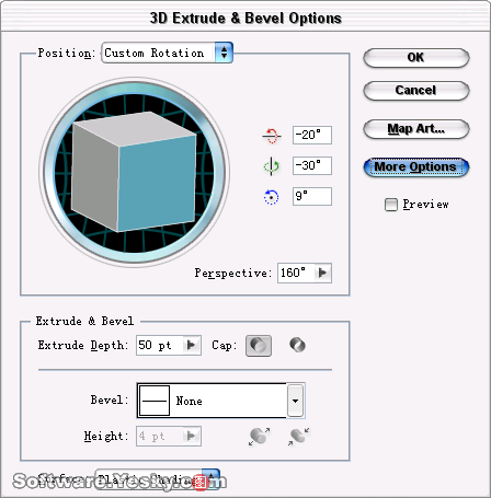 對話框從上到下分為三個控制組,依次是position(方位)控制組、extrude & bevel擠壓和導角控制組(如果是revolve工具則是相應的自身旋轉控制組,rotate工具沒有中間這個控制組)、surface表面控制組。