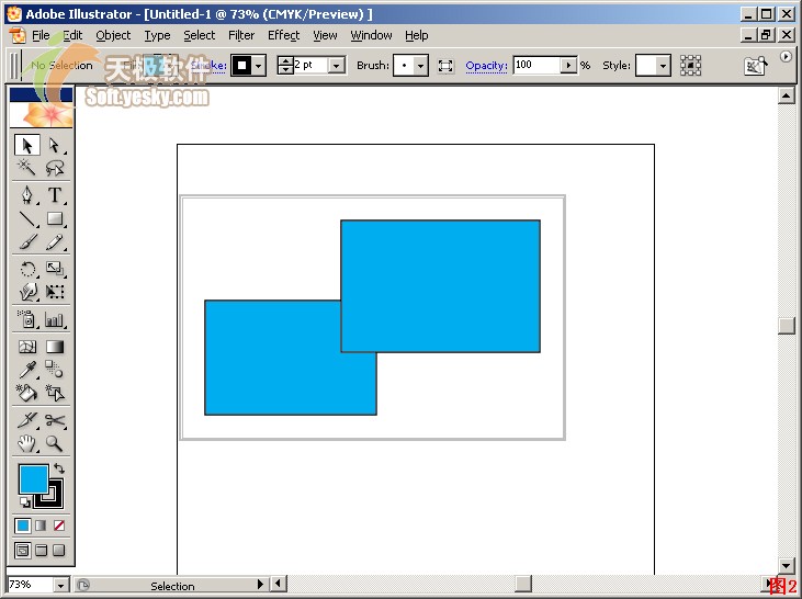 ,它的作用是將組合在一起的對象再分離開。單擊這個按鈕,可以看到如圖2所示的結果,兩個矩形被分離開了,而且在其周圍出現了一個方框。同時,控制面板上的這個按鈕也發生了變化。如果選中一個矩形,再單擊按鈕