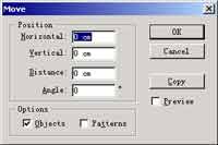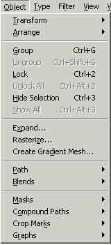 包含transform again(再次變形)、move...(移動)、scale...(縮放)、rotate...(旋轉)、shear...(傾斜)、reflect...(鏡像)、transform each...(單獨變形)、reset bounding box(重設調節框)命令。移動、縮放、旋轉、傾斜、鏡像命令的效果和工具箱中的工具的效果一樣,不過用這些命令可以精確的輸入數值。如移動對話框中就可以精確的輸入橫向移動距離,縱向移動距離、距離、角度等等。