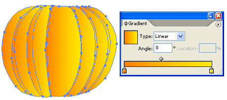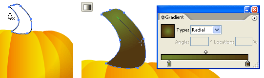 用鋼筆工具畫出南瓜的柄。用一個放射性漸變填充(如圖)。漸變color1: r=111 g=129 b=46, color2: r=82 g=56 b=17。