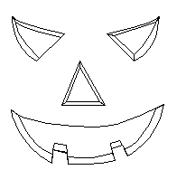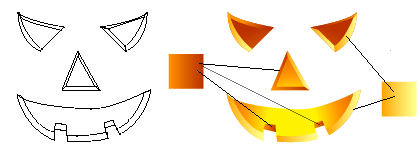 在剛才的南瓜上新建一個圖層。用鋼筆工具畫出鬼臉的基本形狀。選擇鬼臉的所有形狀,用漸變工具進行放射性漸變填充(如圖)。漸變color1: r=255 g=242 b=0, color2: r=255 g=146 b=0, color3: r=187 g=50 b=0。