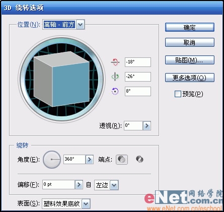 2.將曲線的填充設置為無,描邊顏色設置為深褐色,然后選擇菜單命令“效果 3d 繞轉...”,使用如圖2所示的默認設置。