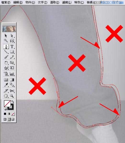 現在我所使用的描輪廓法,造成打x的地方是摟空露出的,箭頭所指的部位是待會要填色的,