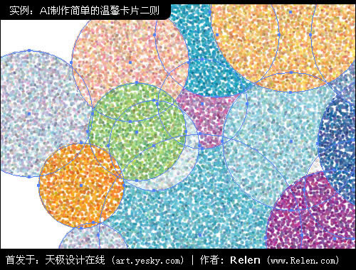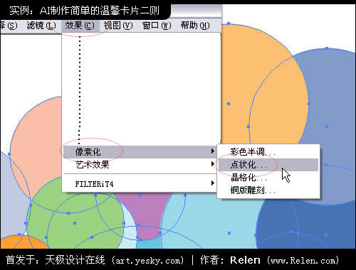 選擇菜單中的 效果>像素化>點狀化 對這些圓進行藝術處理。