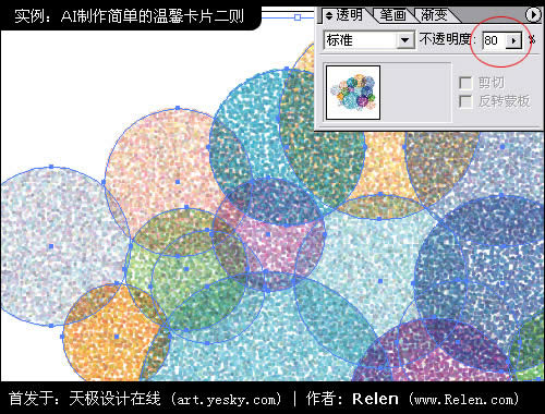 當圓圈相互沒有交融時候,畫面缺乏變化。選中所有的圓,給其透明度設置為80%。