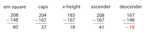 注意你每條輔助線的位置,把它們的數(shù)值記下來,我們將把它們匯總起來做一點小小的計算。有一個基本概念:fontlab 采用 upm (units per em/元素單位)這個術(shù)語來測量字體,然后我們必須想辦法把你在 illustrator 中使用的任意一種單位轉(zhuǎn)換成 upm。首先我們要在 illustrator 中測量“元素方塊”(你的字體中從下降部到上升部之間的距離)。本例中的元素方塊為 60 毫米,因為上升部是 208,下降部為 148,兩者之間的距離是60。緊接著,我們繼續(xù)測量其余的垂直度量在 illustrator 中的單位數(shù)值。