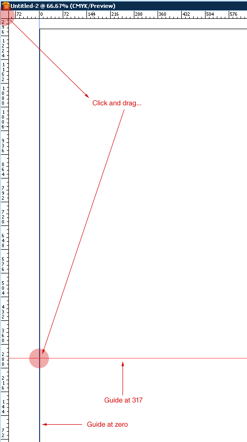 設(shè)置好輔助線之后,我們應(yīng)該在 0 點放置一條水平輔助線。點擊左上角的兩條標尺交匯處,拖拽到 0 點與 317 (本例中的數(shù)值)的交匯點。