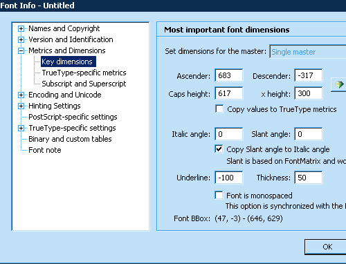 現(xiàn)在我們該新建一個 fontlab 文件了。新建,然后在文件菜單中選擇“字體信息”,展開“度量與尺寸”節(jié)點,點擊“關(guān)鍵尺寸”選項,設(shè)置上升部、下降部、大寫高度、x-高度的數(shù)值,本例中為 683, -317, 617, and 300。