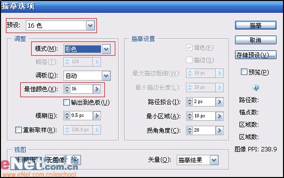 (6)在描摹選項對話框中設(shè)置“預(yù)設(shè)為16色,模式彩色、最佳顏色為16”,單擊描摹按鈕進(jìn)行描摹。