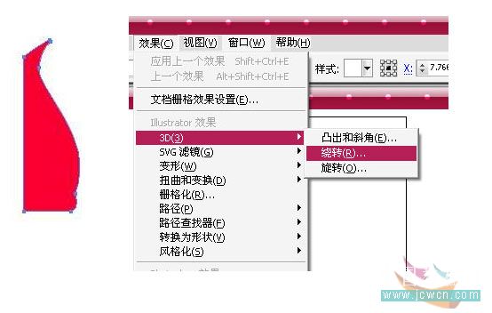 首先,使用鋼筆工具建立如下圖的路徑。打開菜單“效果”“3d”“繞轉”。