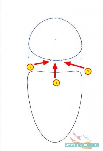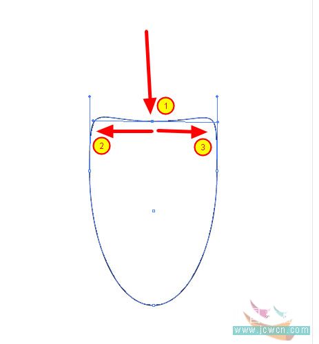 2、使用直接選擇工具(白箭頭),對橢圓進行調整如下圖。將橢圓的最上方的節點拖到中間偏上的位置(3/2左右),拉長此節點手柄。