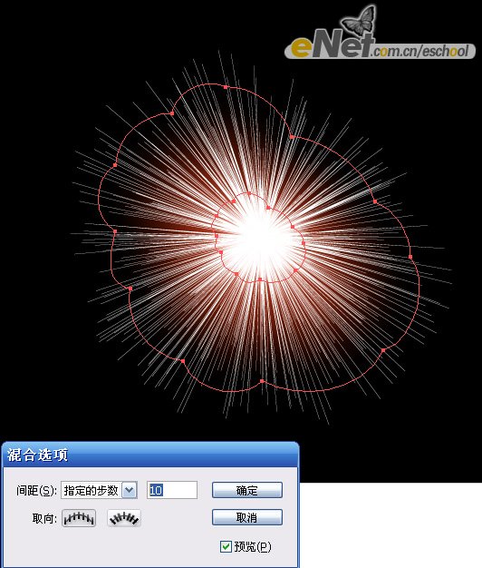 (11)選擇菜單“對象>混合>建立”,設置混合步數為10或10以上的數字。