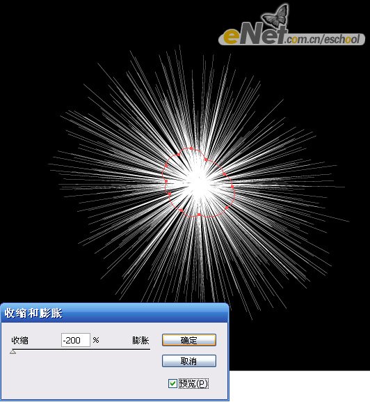 (9)選擇菜單“效果>扭曲和變換>收縮和膨脹”彈出“收縮和膨脹”對話框,設置“收縮”為-200%,效果如圖。