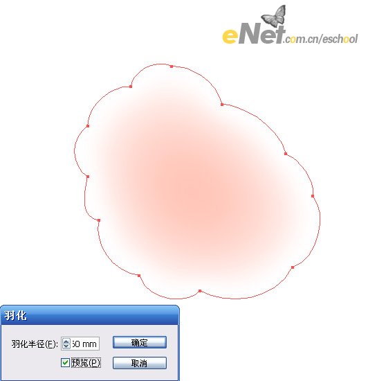 (5)選擇效果菜單“效果>風格化>羽化”彈出“羽化”對話框,將“羽化半徑”設為60mm即可。勾選“預覽”看下效果是否如圖所示。如果沒有達到預期效果繼續修改“羽化半徑”參數。