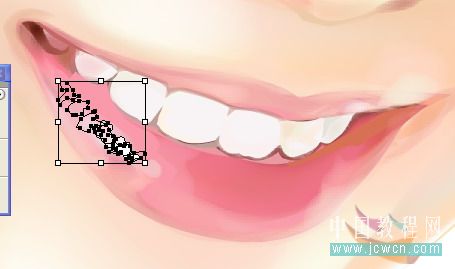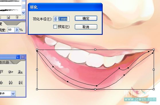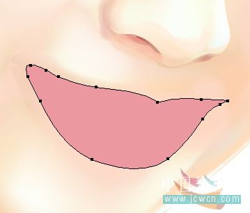 75繪制如下圖的過渡色塊,形狀與下嘴唇的形狀吻合,羽化為1.5~2。