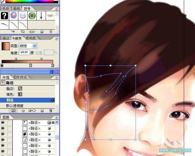 91為額頭上加上頭發的陰影,羽化為3左右,并且要用到漸變和透明度的調整。