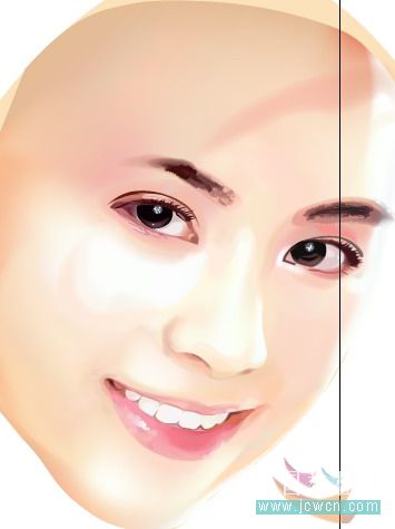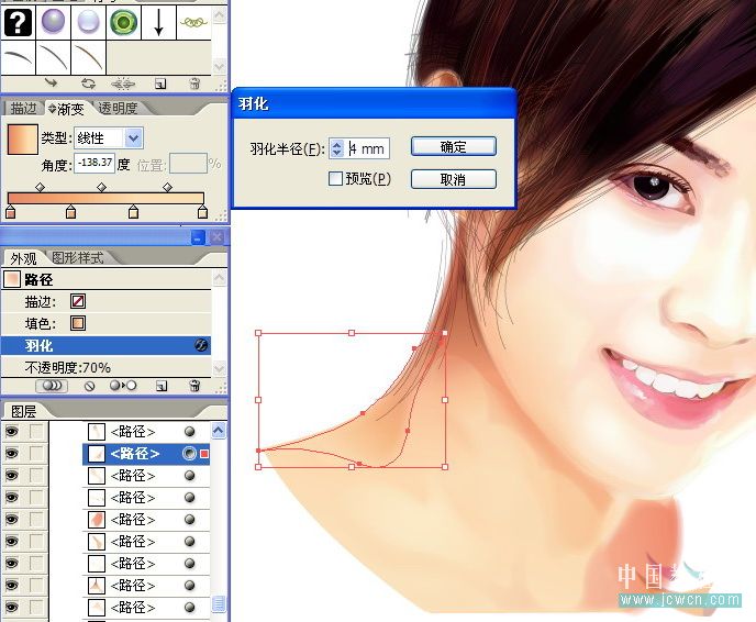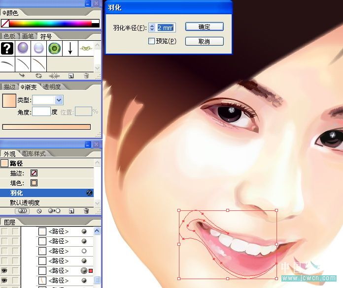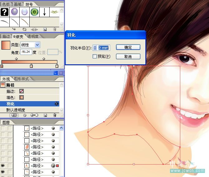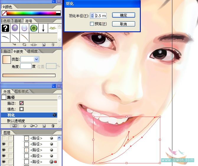 80在下顎添加一塊過渡色塊,漸變由深粉向淡粉過渡,羽化為4。