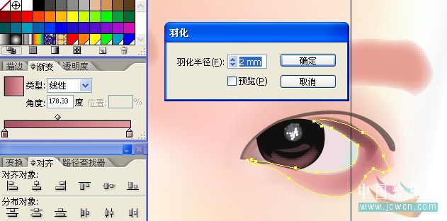 40為其添加眼框的邊緣體積感,羽化為2,漸變由深紅至粉紅過渡。