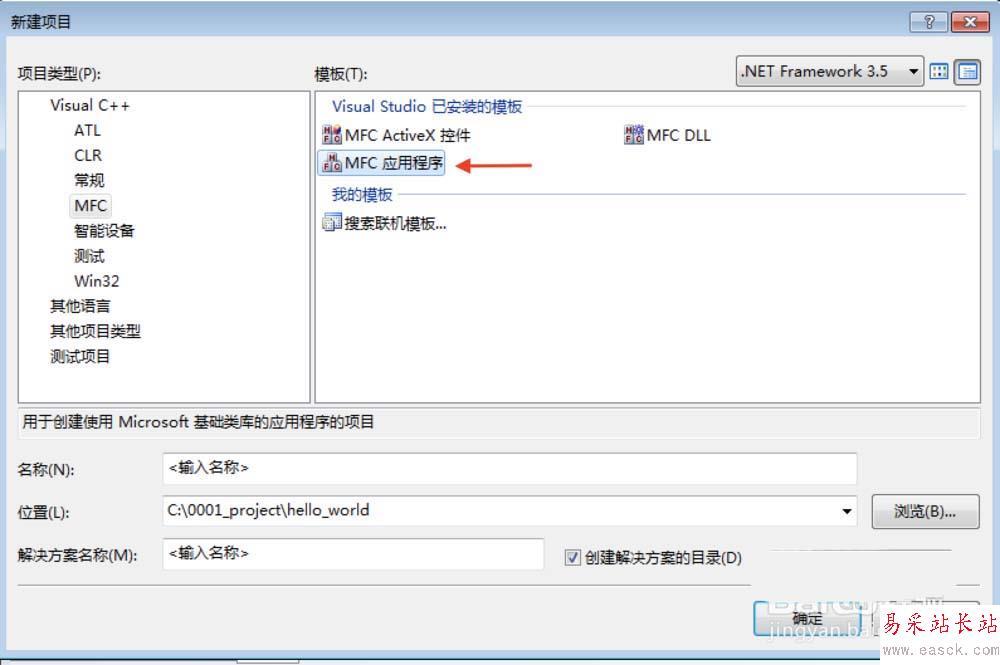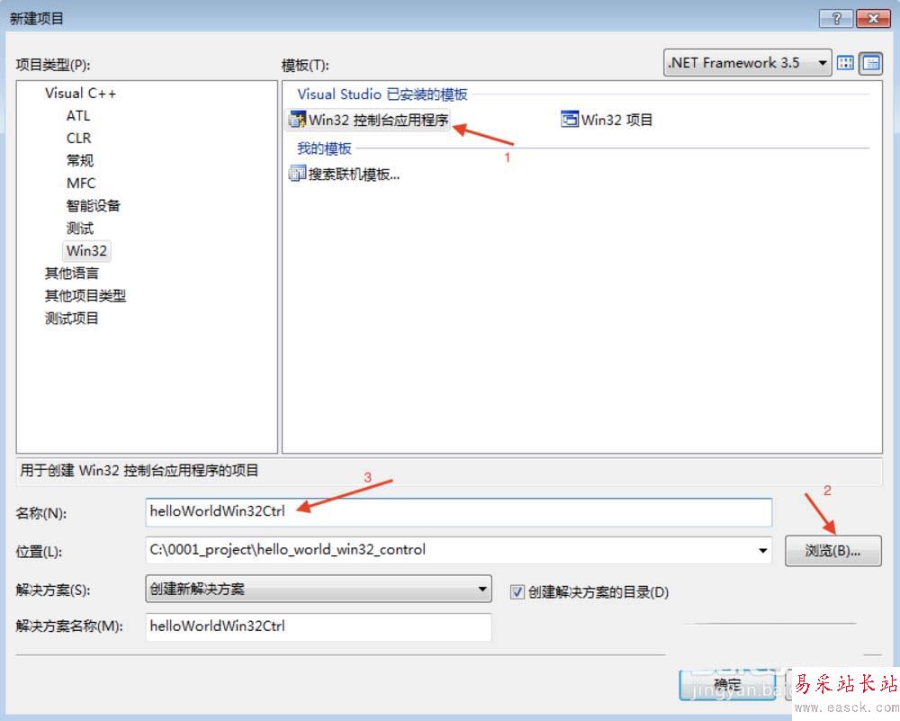 1、首先打開新建項目窗口,選擇Visual C++ -> Win32 -> Win32項目,然后選擇程序存放的路徑,以及輸入程序名稱,最后點擊“確定”