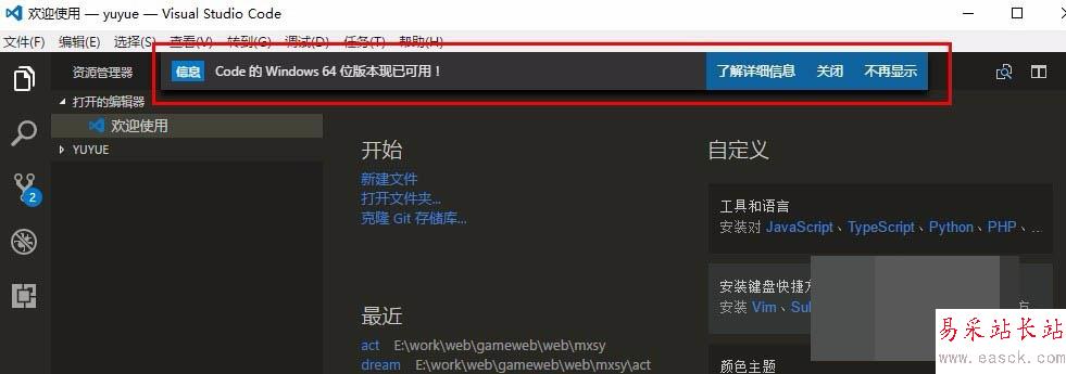 1、通常打開vscode編輯器,都會在主界面頂部提示 有版本更新;如圖所示類似的提示:(小編剛剛已經(jīng)安裝了最新版;)