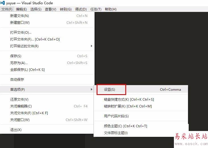 2、那么怎么關(guān)閉這個更新提示呢?首先打開vscode,點擊頂部導航“文件”,鼠標移至“首選項”選項,然后點擊“設置”;
