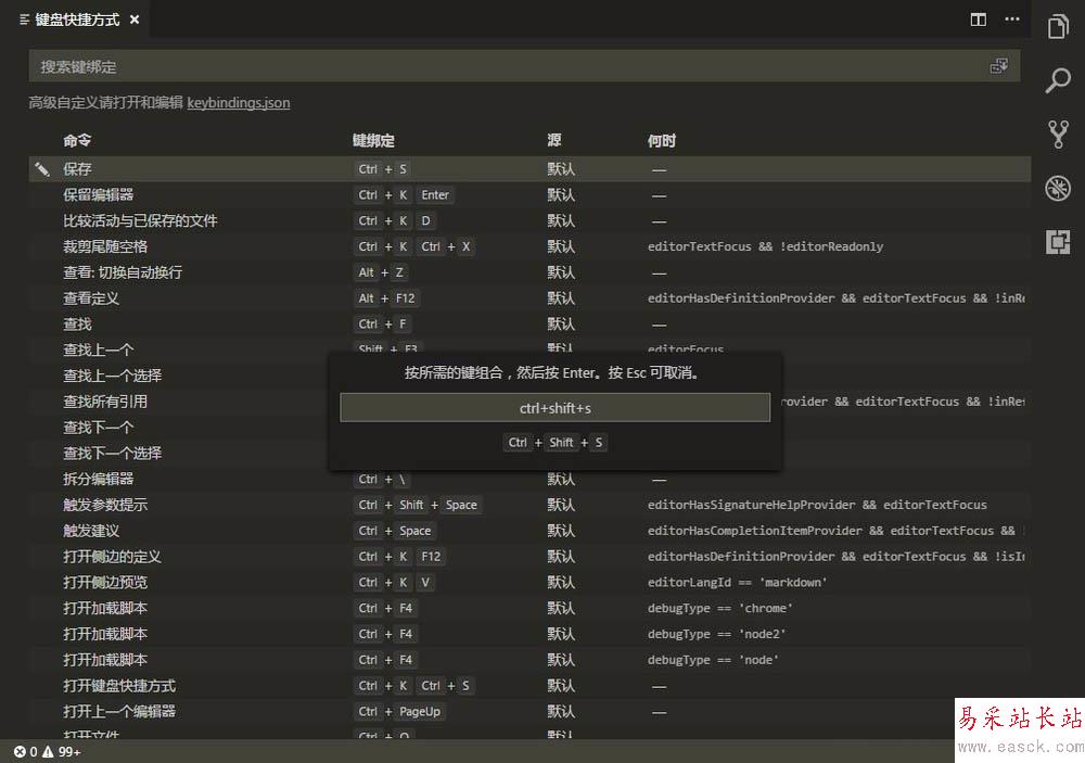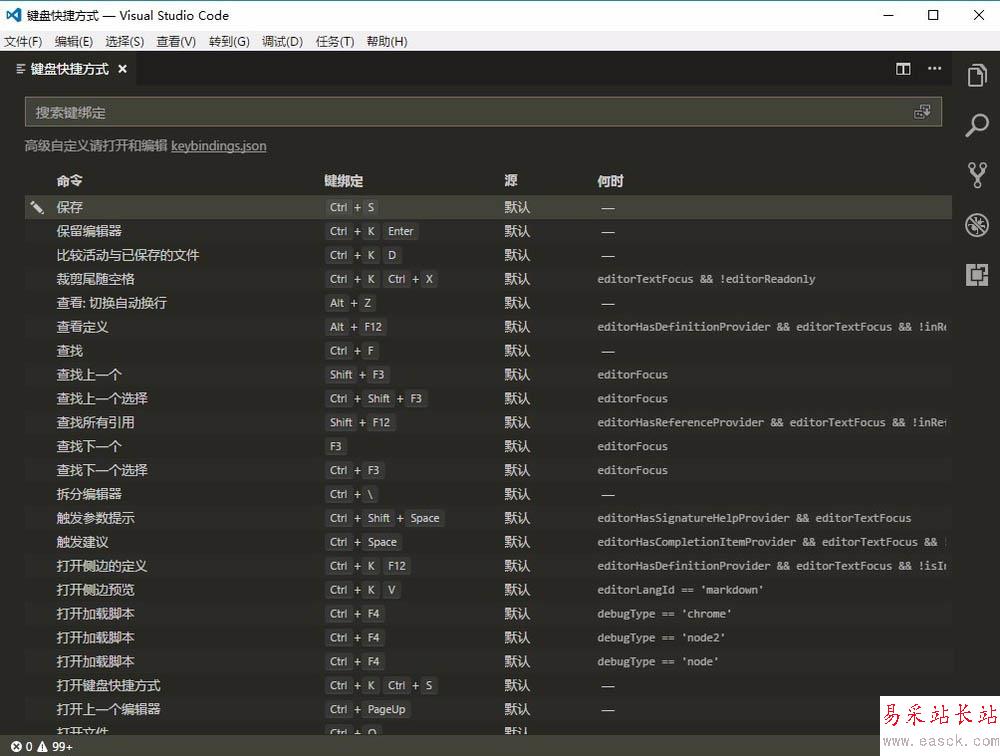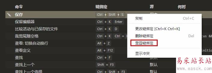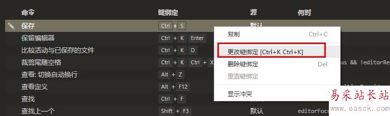 3、下面我們來修改默認快捷鍵設置,比如像修改保存命令快捷鍵,直接右鍵——更改鍵綁定;